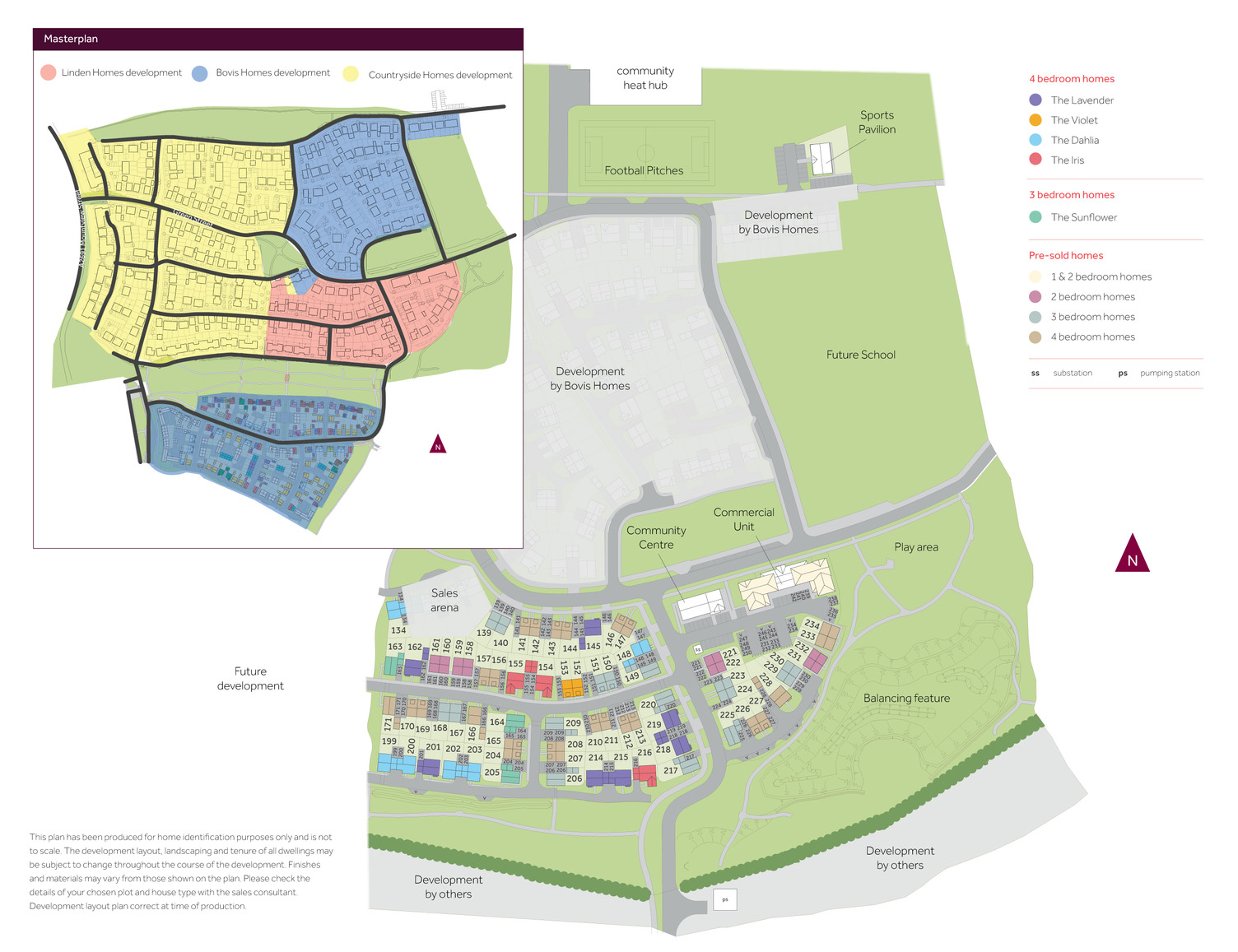 The site plan which can be found on this page, has been produced for home identification purposes only and is not to scale. The development layout, landscaping and tenure of all dwellings may be subject to change throughout the course of the development. Finishes and materials may vary from those shown on the plan. Please check the details of your chosen plot and house type with the sales consultant. Development layout plan correct at time of production.