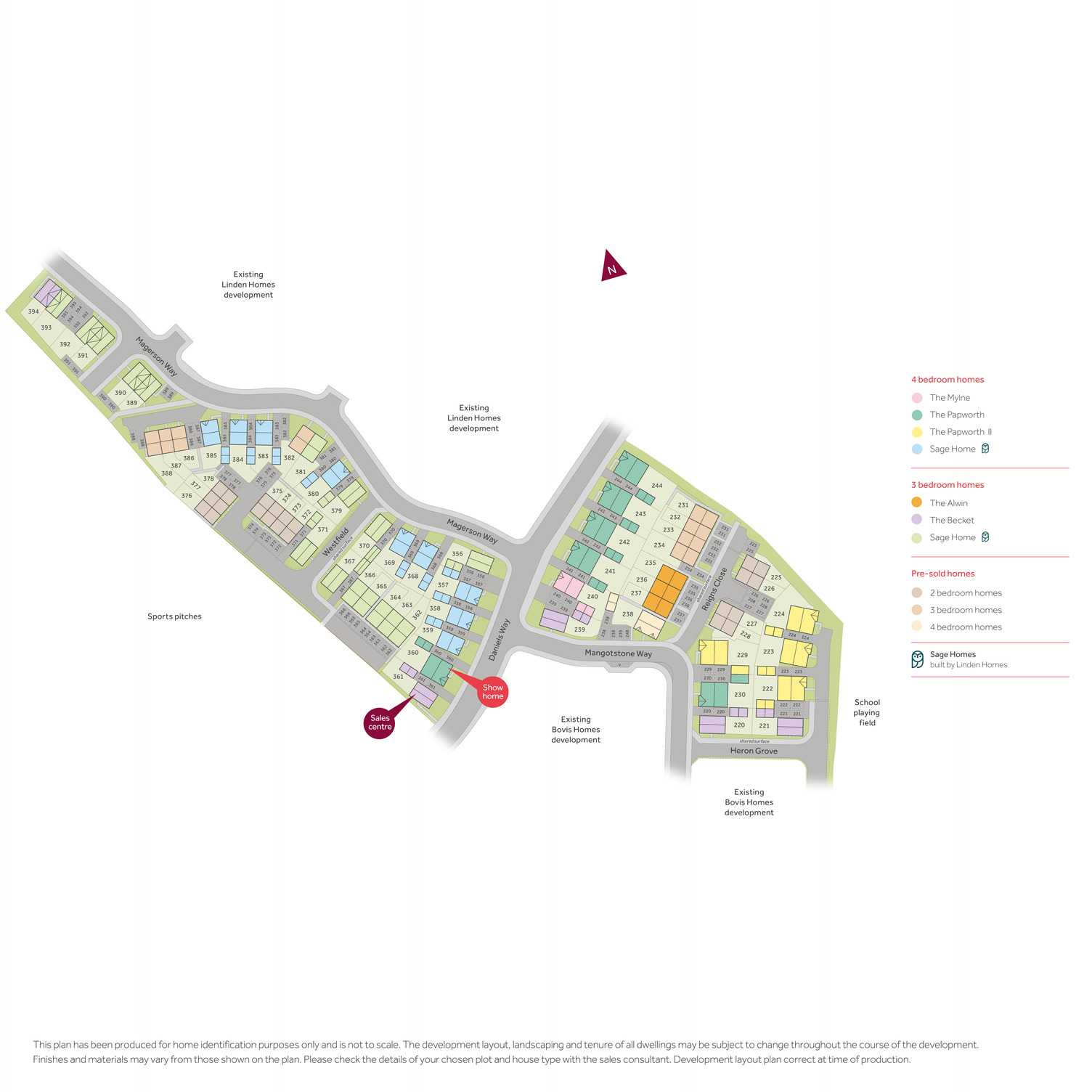 The site plan which can be found on this page, has been produced for home identification purposes only and is not to scale. The development layout, landscaping and tenure of all dwellings may be subject to change throughout the course of the development. Finishes and materials may vary from those shown on the plan. Please check the details of your chosen plot and house type with the sales consultant. Development layout plan correct at time of production.