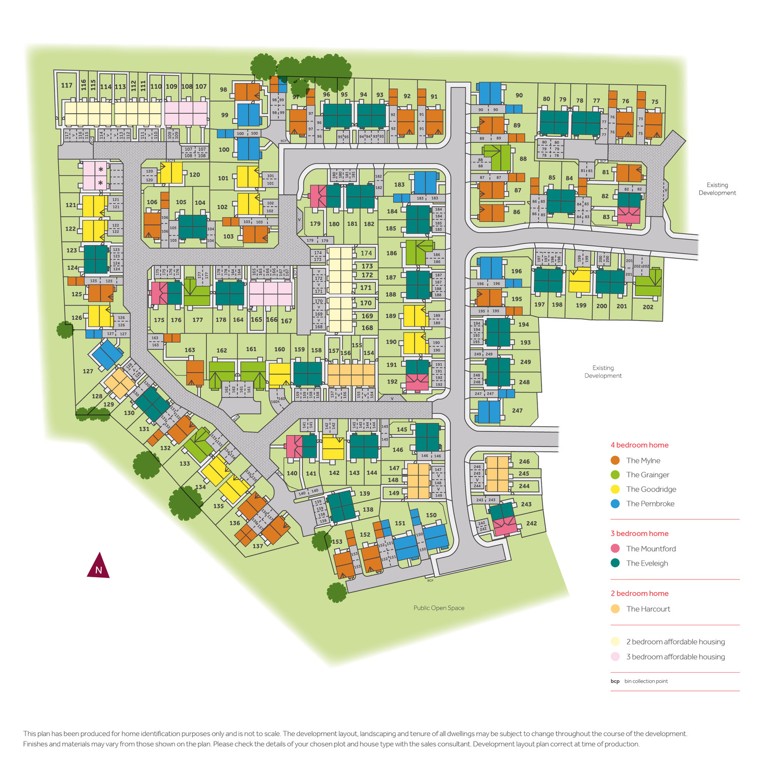 The site plan which can be found on this page, has been produced for home identification purposes only and is not to scale. The development layout, landscaping and tenure of all dwellings may be subject to change throughout the course of the development. Finishes and materials may vary from those shown on the plan. Please check the details of your chosen plot and house type with the sales consultant. Development layout plan correct at time of production